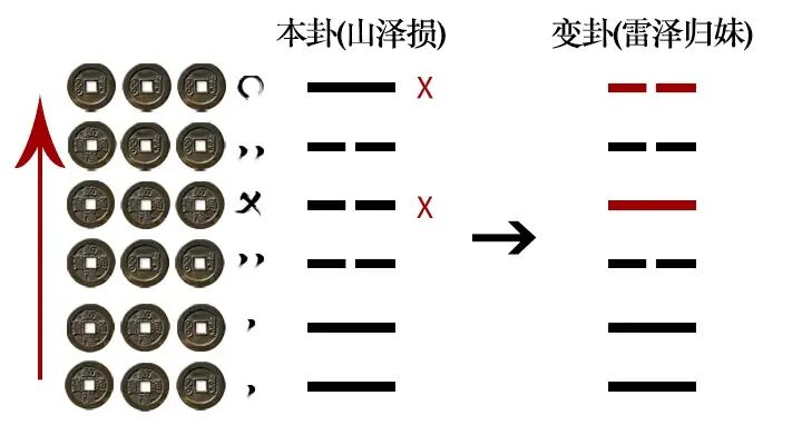 点卦之后,我们就得到了一个本卦。根据卦中动爻,老阳变少阴,老阴变少阳的规律,我们还会得到一个变卦。