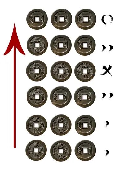 当求测者放松之后,将铜钱握于手中,心中想着所求之事,只能想这一件事,不可胡思乱想。然后摇动手中铜钱,散于桌面或盘中,卦师依据铜钱的正反状态,在纸上记好“、”或“、、”或“X”或“O”。如此摇六次,一卦摇完。卦师在点卦的时候,要从下往上点。也就是先从初爻开始,然后二爻,三爻…直到上爻。