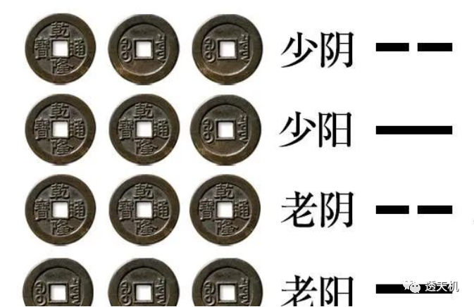 用三枚硬币,硬币的正反面可以作为阴阳起卦,无字的一面(背面)为阳为“背”,有字的一面(正面)为阴为“字”。关注透天机。摇卦时记录无字一面出现的个数,也就是五角硬币花面朝上的个数。