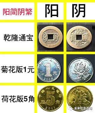 二、摇卦法方法简介:(请不要忘记写上求测时间。摇卦时间尽量避开子时,即23-1点) 找一个清洁、安静的环境,旁边无人打搅。准备好纸、笔以及三枚一样的硬币。(以三枚乾隆通宝最佳,没有的话,可以用三枚菊花版1元或者荷花版5角代替)。阴阳属性划分如下图。三、具体操作步骤: