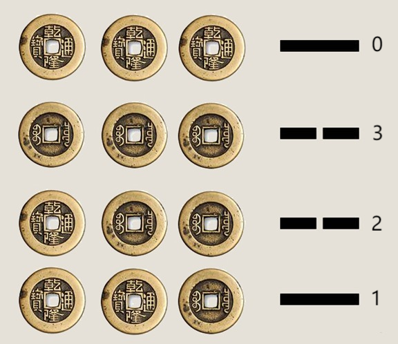 如果三枚硬币都是花面,即三个阳面,为老阳,记“3”;如果其中有两个是花面,即两个阳面,为少阴,记“2”;如果其中有一个是花面,即一个阳面,为少阳,记“1”;如果三枚硬币都是反面,即没有阳面,为老阴,记“0”。女测与男友感情,能不能结婚