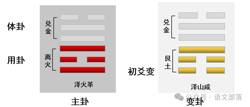 如《天地否》卦三爻动,则上卦乾☰为体卦,下卦坤☷为用卦。三爻动,则上卦乾☰不变,下卦坤☷变出艮卦☶,艮卦☶即为变卦。变卦代表事物后期、最终结果。