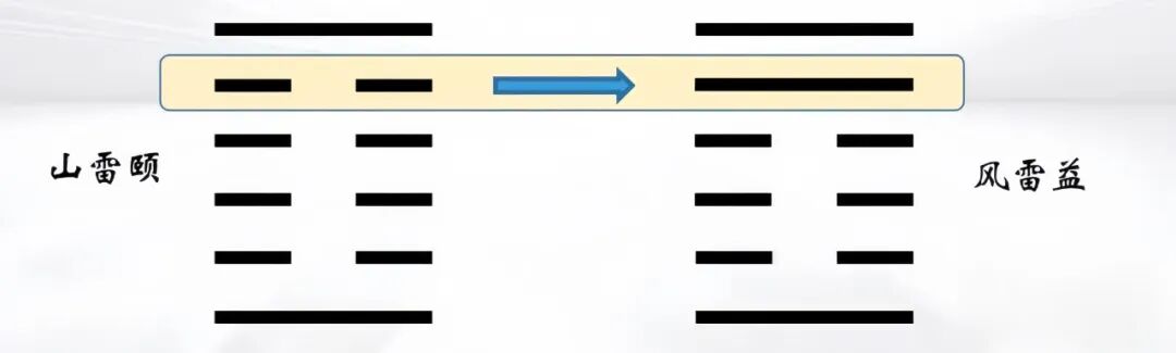 动爻在第五爻,就是在上卦,第五爻的阴爻变成阳爻,艮卦就变成了巽卦,巽为风,下卦没有变化,所以变卦就是风雷益卦。
