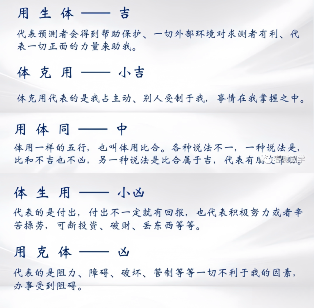 第三步:标出变卦的体卦、用卦,用金木水火土五行的生克关系来断吉凶。原则就是,体卦是自己,用卦是别人,我克别人为吉,别人克我为凶,别人生我为吉,我生别人为不吉,我和别人一样就一般。