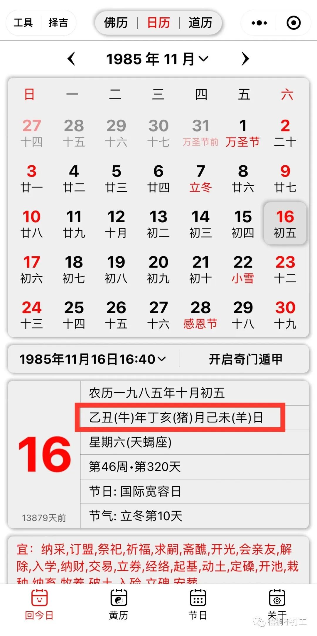 很简单,只需要手机联网打开万年历,调至1985年就可以查到,如下图