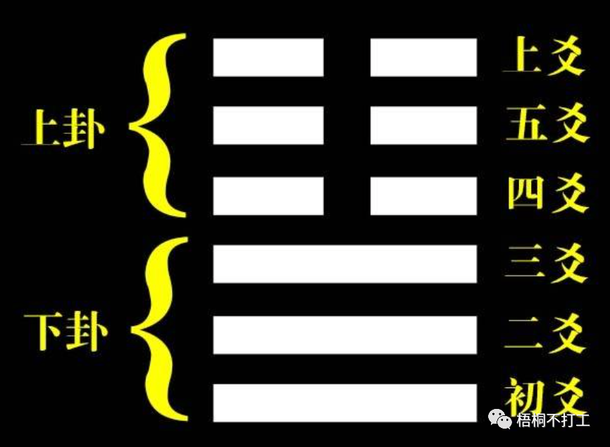 易经64卦的每个卦都是由6个爻,即2个卦,组成的。上半部分叫上卦,下半部分叫下卦。从下至上依次为初爻、二爻……五爻、上爻。如下图: