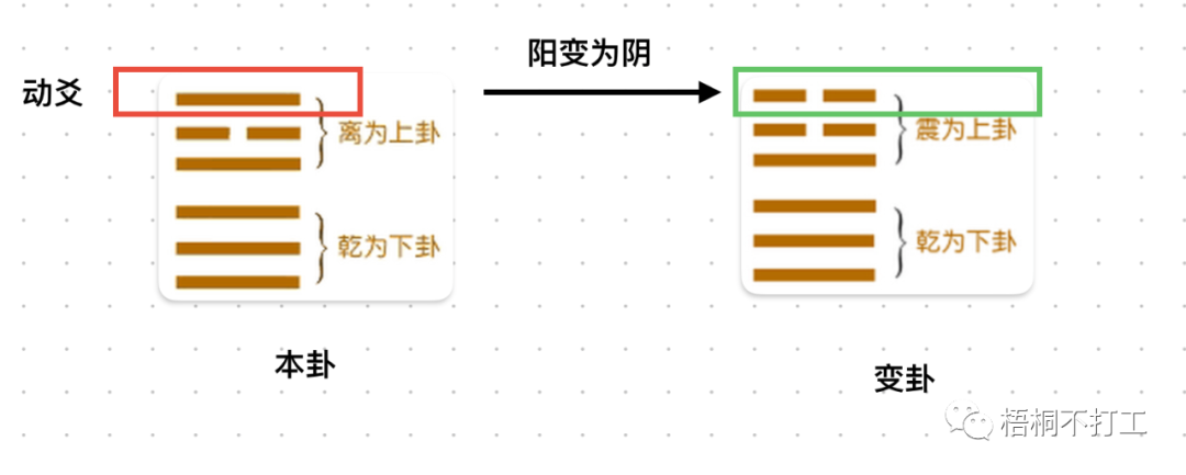 Step 4 求变卦。当我们求出本卦后,把本卦的其中一个爻进行变动,变动后的卦即为变卦。如为阳爻,则变为阴爻;如为阴爻,则变为阳爻。映入眼帘的第三种颜色就决定了动爻(动爻:即需要变动的爻)是哪个。如果是6以下直接用;如果是6以上,用该数字除以6,所得的余数即为动爻。