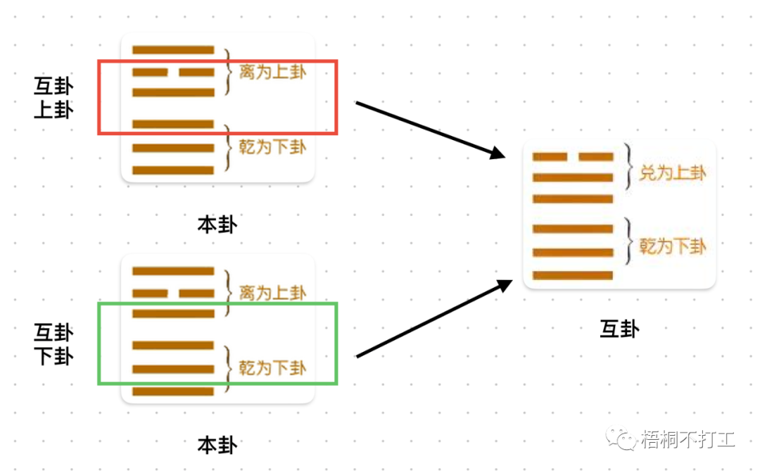 第三步:取本卦的三、四、五爻为兑卦,则互卦的上卦为兑卦;取本卦的二、三、四爻为乾卦,则互卦的下卦为乾卦。