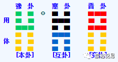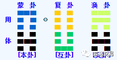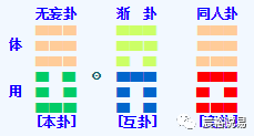 中间的这个互卦呢,是从主卦里面“抽”出来的,主卦的二爻到四爻,为互卦的下卦,三爻到五爻为互卦的上卦,本例中,主卦从下往上数,二爻到四爻,为艮卦,三爻到五爻为巽卦,上巽下艮,即《风山渐》的卦象。到此,一个完整的卦,就列出来了。