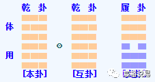 求动爻呢,则用33除以6即可,这个33的数字,就是年地支序数、农历的月日数字、时辰地支序数的总和,刚才求下卦的时候,已经算出来了。33除以6,余3,则三爻动,《乾为天》的三爻动,阳爻变阴爻,变卦则上卦乾,下卦兑卦,变成了《天泽履》。至于互卦呢,还是从主卦里面“抽”出来,但是因为是纯阳爻的卦象,所以互卦同样是《乾为天》。