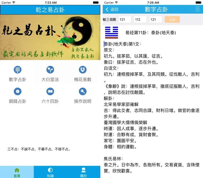 乾之易占卦-实用周易入门和占卦软件,不需联网,提供五种占卦方法:数字占卦、大衍筮法、梅花易数、铜钱占卦、六爻排盘,有了该软件,随时随地可以占卦解卦。采用的是周易六十四卦的卦爻辞和焦氏易林的四言诗,以及高岛易断的占辞。“无有师保,如临父母”。四种占卦方法,除大衍筮法需要使用五十筹策按步骤成卦,较费时间外,其它四种方法起卦简单易操作。占卦是为了预知,周易首先是一本占卜之书,其灵验经过了几千年的检验,非常神奇,《左传》、《国语》等记载了大量占卦事例。周易也是一本思想哲学之书,为六经之首,群经之始。