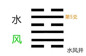这样一来,上卦就从坤卦变成了坎卦(坎为水),下卦仍然为巽卦(巽为风),这样,我们就可以得到这一卦的变卦,水风井卦。