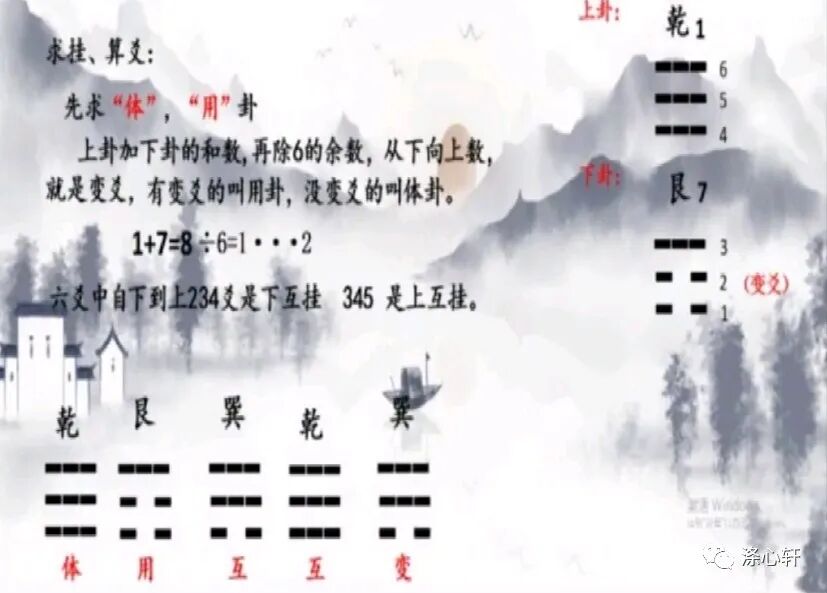在得出二个基础爻卦爻后,以带变爻的为用卦,不带变爻的为体卦,计算方法为:上卦的起卦数加下卦起卦数总和除6的余数为变爻,有变爻为用卦,顺序由下以上数,比如上卦是1下卦是7就是1+7=8-6=1.2,取2,如图中所示