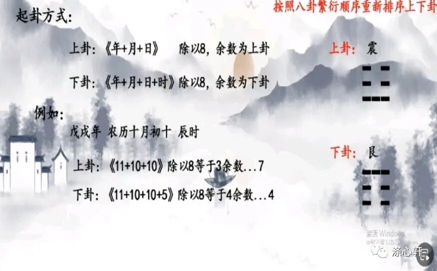 第二种方法是用时间进行排卦,这种方法需要用到前面讲过的干支,前面已经介绍过了干支所在本法中的作用,在时间起卦时就是把年月日时还原成干支所代表的数并且相加既可,时间起卦以年加月加日得上卦,年加月加日加时得下卦,但是具体上、下排列以卦爻所代表的顺序为主,比如:上卦为7下卦为4,但由于4在前所以以4代表的震为上,7代表的艮为下,以此类推,其中的年月日时的数字就是他们对应的干支和或数字为主,比如戊戌年就是戍的11,庚子就是子的1,而月日就是正常的几月几日,如三月初十,就是3和10,时辰就是时间对应的时辰,比如辰时就是5,所以就是上卦11+3+10除以8的余数(3)下卦是11+3+10+5除8的余数(5)