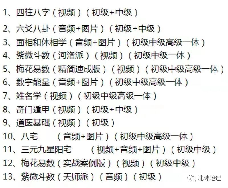 3)授课时长:17节课,每节课约80分钟。4)课程特色:阴盘奇门是真正的神奇之门,刘老师很多案例是现场直断的,让学员感受到奇门遁甲的神奇力量。奇门前半部分传授的是基础知识,搭建理论框架。后半部分传授实战知识,以课堂学员起盘为案例,现场直断,讲理论与实战完美融合。相比于其他术数,奇门遁甲最大的优势及运筹和调节,本门课程讲述阴盘奇门的调解方法。9、八宅与居家环境初中高级一体班(音频+课堂笔记)1)授课内容:易学与河洛基础;先后天八卦;阴阳五行;八宅详解;八宅大游年歌;宅命算法;八宅断事;八宅实战案例应用;房间净宅,净化,物品加持方法。2)授课方式:视频+教材。3)授课时长:16节课,每节课约60分钟。4)课程特色:八宅理论初中高级理论讲完,授课老师信德是全真龙门第二十五代传人,从事玄学阴阳宅、等领域的研究及运用。实战经验非常丰富,老师讲课深入浅出,理论紧密结合实践案例及户型分析,能使学员由理论快速进入实战状态。老师会在课堂传授经实战验证行之有效的房间净宅,净化,物品加持方法。 这些方法是独家师门技法,避免失传,所以公开,外面很难找到。10、姓名学初中高级一体班(视频+教学课件)1)授课内容:五个剖象法简介,生肖起名法;八字喜用神起名法;汉字五行分析与归类;姓名内部组合分析;起名禁忌;个人起名一般步骤;企业起名方法与技巧。2)授课方式:视频+教材。3)授课时长:16节课,每节课约60-90分钟。4)课程特色:八字命理起名课是目前市面上最合理也是最流行的起名方法,青枫老师八字功底深厚,起名经验丰富 。学习过青枫老师的八字基础课后再进修起名课,易如反掌,如一层窗户纸,一点就透,有事半功倍之效。市面上随便起一个名字都要上千,认真学习本门课程,自己家亲友家的孩子起名不再求人。11、数字能量初中高级一体班(音频+教学课件)1)授课内容:数字基础知识理论;数字影响人的原理;数字组合的能量;手机号码分析方法;通过手机号码解读使用者的性格;通过手机号码分析使用者的格局及财富级别及健康事业。2)授课方式:音频+丰富教材。3)授课时长:13节课,每节课约60-90分钟。4)课程特色:数字能量基于宇宙全息理论。无需见面,无需对方生日时辰,对方打一个电话大概能知道对方的性格、格局、财富层次,相处之间做到有的放矢。学会本门课程可以帮助自己和亲朋好友选取吉祥号码,为人生助力。12、梅花易数初级班(视频+辅助电子书)1)授课内容:八卦万物类象与六十四卦讲解;主卦、互卦、变卦及动爻的表示方法;多种梅花易数起卦方法:时间起卦法、来人扔数起卦法、按随意翻书页数起卦、按字的笔画起卦、电话号码起卦等;梅花易数的体用说;体用互变的内在关系;卦象直读法;梅花易数分类预测:测升职、测官运、测财运、测升学、测天气、测来意、测灾祸、测官司、测失物、图片直断等;断好梅花易数的诀窍。2)授课方式:视频+辅助电子书。3)授课时长:15节课,每节课约60分钟。4)课程特色:授课老师马修林,实战经验丰富,断卦灵活,课堂上随机取象断卦,课程实战性强。两门梅花易数,对比学习,见的多才能识的广。13、天师派紫微斗数初级班(音频)1)授课内容:紫微斗数十二宫;紫微斗数四化星,十四主星和部分杀星;格局小行星讲解;财帛宫、夫妻宫、疾厄宫实战讲解。2)授课方式:音频。3)授课时长:40节课,每节课约0.5小时。4)课程特色:天师派紫微斗数,老师脑洞大开,适合年轻人,适合无基础的同学入门提高兴趣,有基础请学上文另一个紫微斗数课。