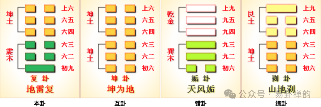 首先来了解一下梅花易数中卦的构成。一组完整的卦由三个副卦所组成,通过起卦最初得到的是主卦,亦称为本卦。本卦的二三四爻相互组合,以及三四五爻重新搭配,便形成了互卦。而本卦中的变爻,遵循阴爻变阳爻、阳爻变阴爻的规则,由此产生的卦即为变卦。