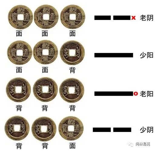 三个背为老阳,叫“重”,记作“—o”(或用数字9表示),老阳发动则变为少阴;