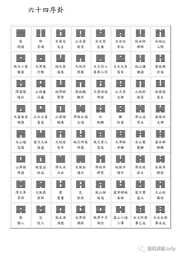 五、查卦:初学者可根据摇卦的记录,对照「64卦图」先查找出本卦,之卦(变卦)、互卦,再表注细节(如体、用、五行生克等)。