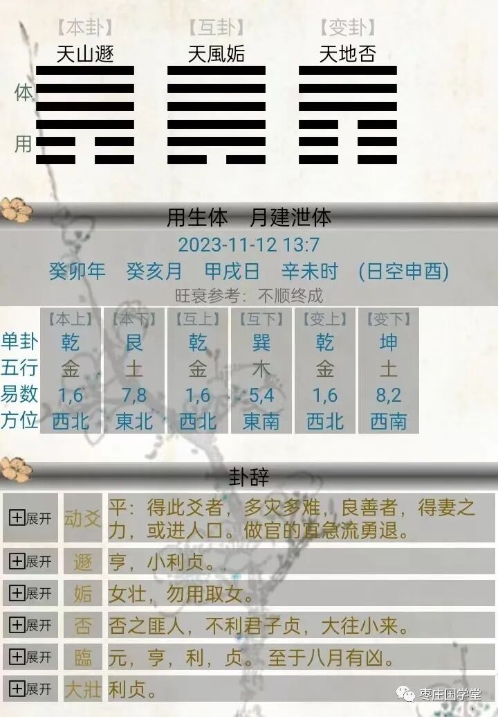 次言第二人情况是因为,乾中爻为正位,乾阳艮阳同类人,我是做易学工作的,对方也应该是易学之人,变离为信息,下入变坤则晋,则为来询问教学班,教学资料问题。乾上爻变兑,兑艮同为少阴少阳相配,故而如果第二人问教学资料问题,那么第三人就是问教学班问题了。因为天地否。统6卦之体,又在变卦,所以最终都会离去的。不会报班的。毕竟,乾上,坤下,阴阳不交。