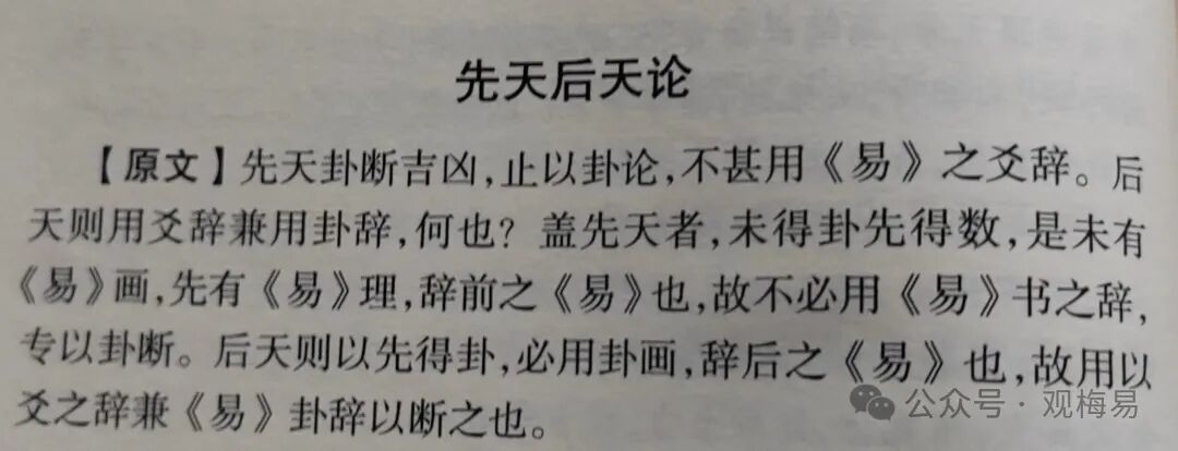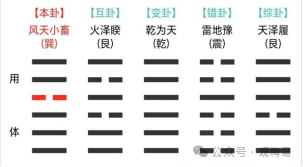再看其背景是悲鸣,悲鸣应悲事,此为凶。此例取巽为鸡,受乾冲克,应凶,又变出乾来回头冲克,故又一凶,乾为刀剑,故受刀剑之伤,杀鸡之意,又一凶,最后看应期,巽为辰巳,故取第十日巳日。通过讲解这两个案例,断此类卦一般有四步骤:一以见闻之事断吉凶,这也是外应的一种运用方式,如喜色断喜事、悲鸣断悲事。;二以爻辞断吉凶,但需要注意的一点是,有些爻辞不显示吉凶成败之意,则必须再回到外应、或卦内体用生克当中,不必拘泥于爻辞;三以体用生克断细节。这里就不是断吉凶之事了,往往在前两步就已经讲吉凶断好,卦的作用仅仅是作为细节的补充;四以占卦人行走坐卧及急缓状态断应期。此点我认为在当今时代并不适用,在网络发达的当代,占卦人往往都是一动不动的、仅仅通过网络来进行对话,也就不存在说明行则急 坐则缓的情况了,如还固执的遵循此法,岂不是说目前大部分卦的应期就是十分迟的?显然不符合常情常理。应期还是得回归到卦之中。其实这些解法都藏匿在原著中的各个角落,所以学习梅花易数的易友们在学习的各个阶段都可以回过头来细细品读原著,定然会有新的收获