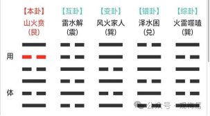 喜色占原文:壬申日午时,有少年从离方喜形于色而来。问其有何喜,曰:“无”。遂以少年属艮,为上卦。离为下卦,得山火贲。以艮七、离三加午时七数,总十七数,除二六,零五为动爻。贲六五爻,曰:“贲于丘园,束帛戋戋,吝,终吉。”辞已吉矣。卦为贲之家人,互见震坎,离为体,互变俱生之。断曰:“子于十七日内,必有币聘之喜。”至期果然定亲。小畜之六四:有孚,血去惕出,无咎。此爻辞看不出问题的吉凶,孚是诚信,讲的是诚信问题,那么这里就不必拘泥于爻辞了。