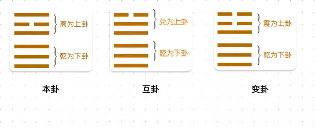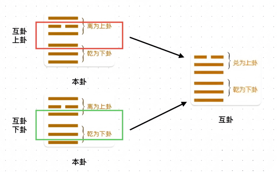 取本卦的三、四、五爻为互卦的上卦;取本卦的二、三、四爻为互卦的下卦。