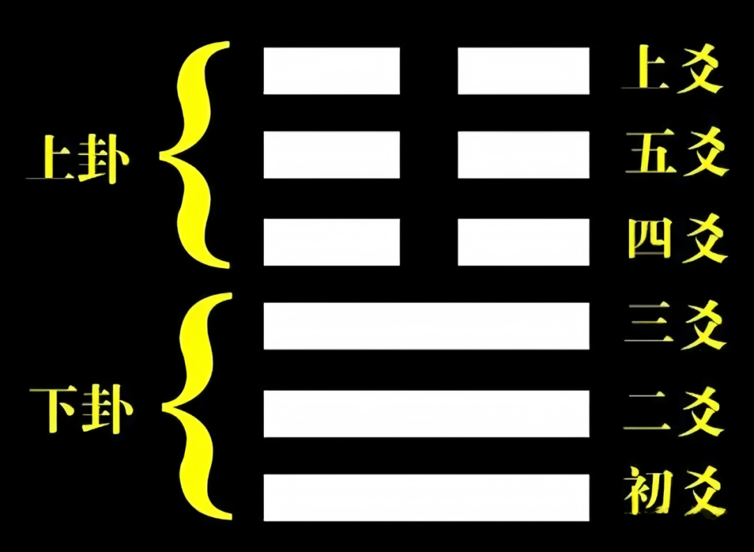 二、占卜中《易经》六十四卦的每个卦都是由六个爻,即两个卦组成的,上半部分叫上卦,下半部分叫下卦,从下至上依次为初爻、二爻……五爻、上爻。