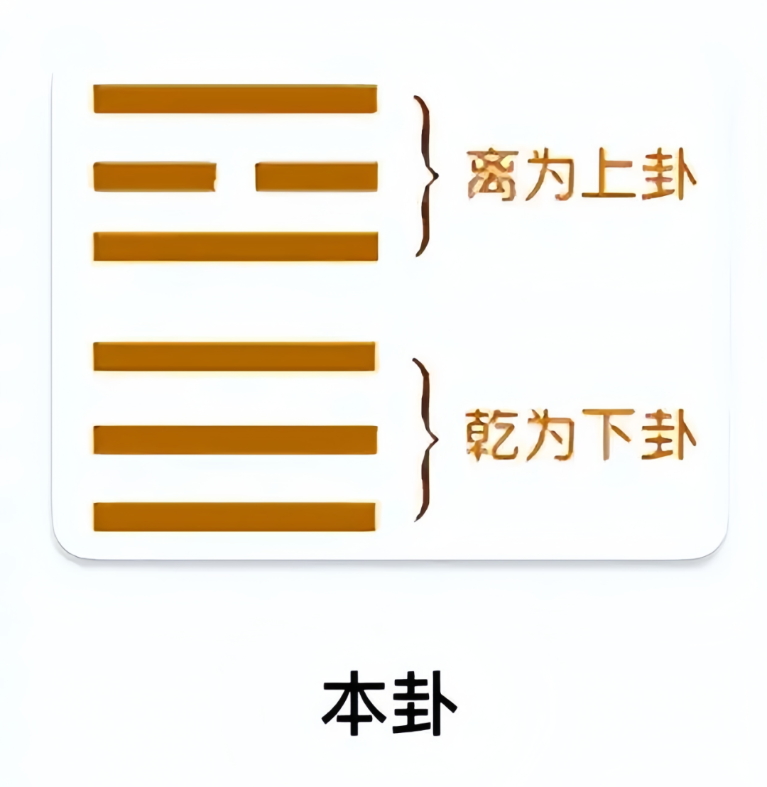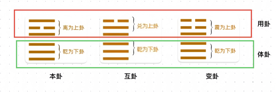 映入眼帘的第一种颜色为本卦的上卦,第二种颜色为本卦的下卦。