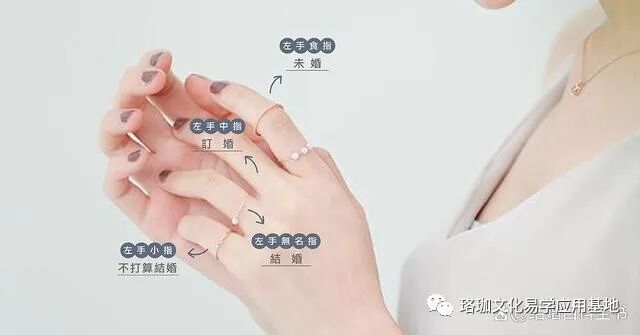 在国际上,戒指戴在食指上说明单身,左手中指佩戴说明订婚状态,左手的无名指表示已婚,佩戴在右手中指和食指表示单身待婚,小指表示不婚。戒指戴在左手表示对爱人的忠诚和爱,戴在右手则是表示对自己的祝福。