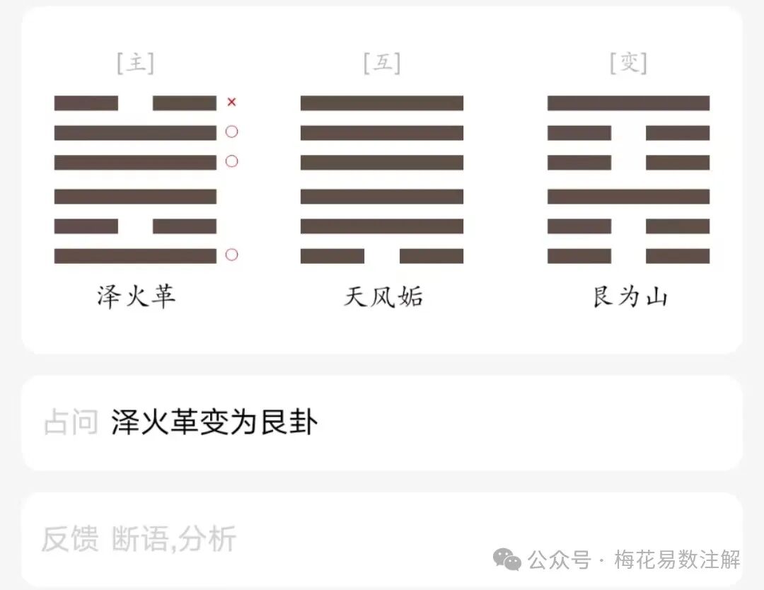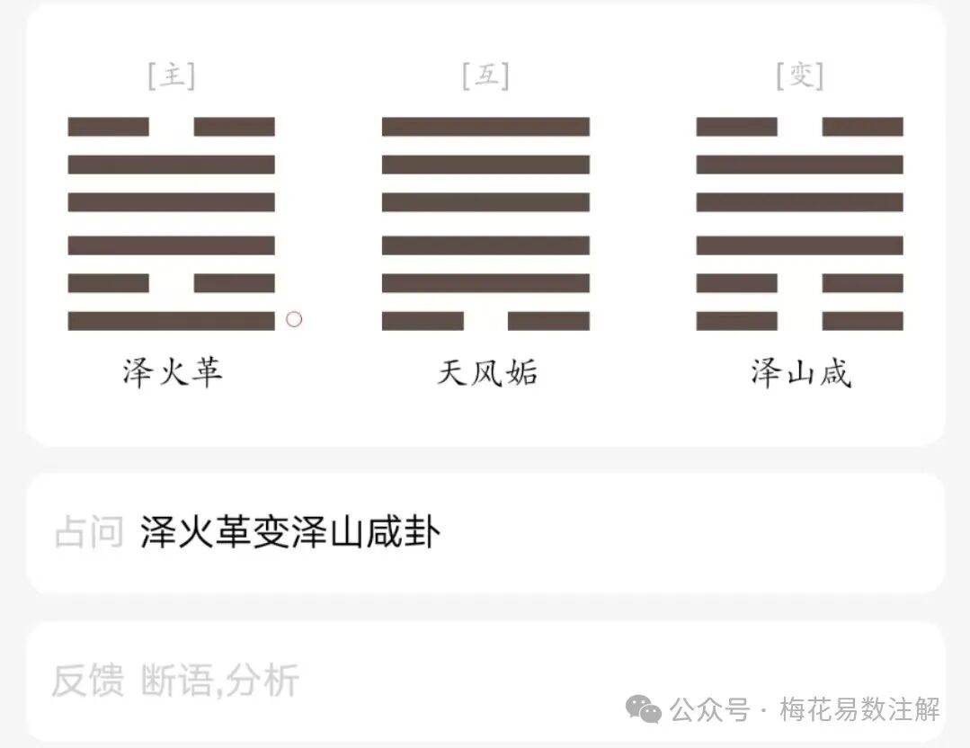 本卦得泽火革,为少女,近物为口,远取羊。内离为中女,近日,远取雉。初爻变艮卦为土,土能生金,则扶起兑金之妹。次除去初爻,移上四爻,又成巽木,断