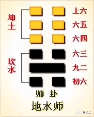 此卦为:上卦为坤,下卦为坎,动爻为上爻,也就是上六。如下图。这个卦名叫地水师。
