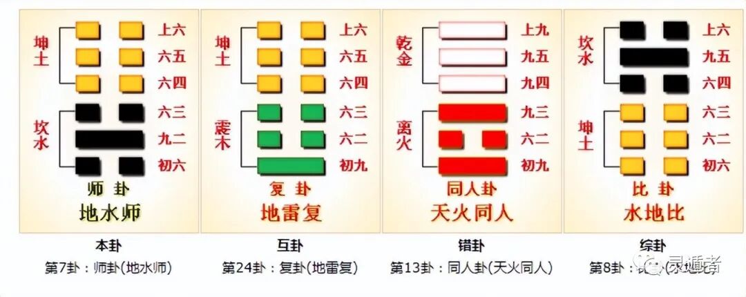 以上面地水师卦为例。他们的互卦,错卦,综卦如下图所示。