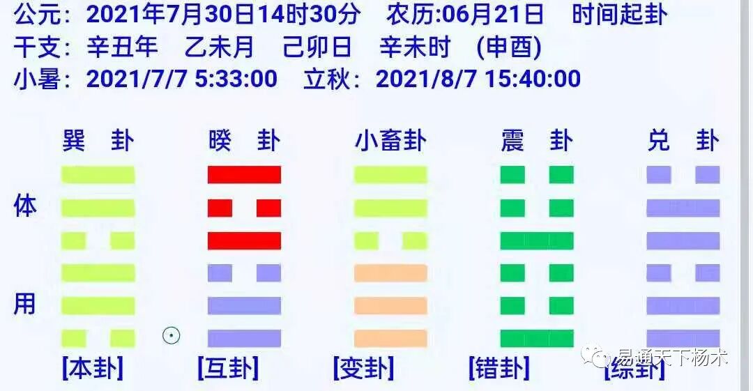 3、分清体用关系,体为我、为主,用为宾,为客。本卦中的体卦和用卦为内卦的体用关系,本卦与互卦、外挂的关系为外挂的体用关系,也就是所谓的一物一太极。所以在具体的占卜过程中,并不仅要看体卦、用卦的关系,也要看所有卦与体卦的关系,以及每个卦所代表的方位、声音、言语、地理、天时之类的信息。