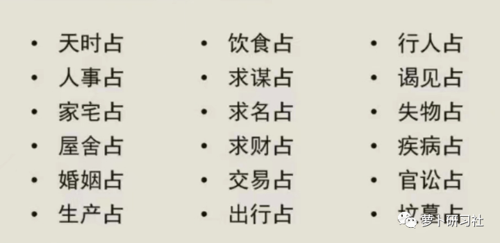 起卦断卦必有因,一般人们是在遇到选择的时候,不知道如何抉择去起卦的。例如:考学建议、跳槽方向、专业选择、就业思路、生意机会、婚恋人选等等都可以是起卦的因。下面列举梅花易数分类占卜的十八项: