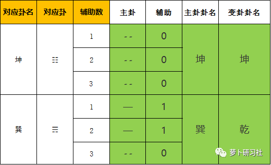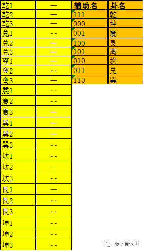 随后分解每一爻,如下分解,根据上卦卦名加上1、2、3来区分上卦的三个爻,下卦同理,再根据前面的动爻位置,来使用辅助表引用得到变卦。参考公式见表格,给出来,无表格也无法理解。这里只展示思路。辅助表如下: