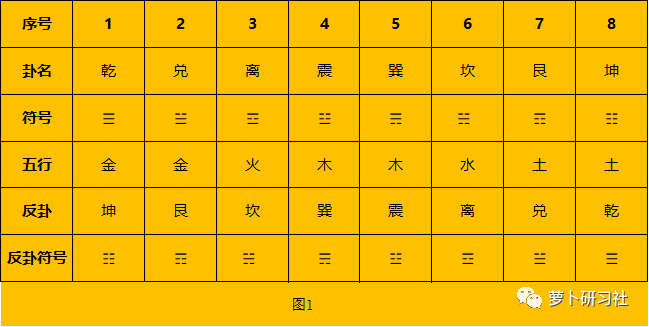 我们先来看看八卦卦名、符号、以及卦的五行属性: