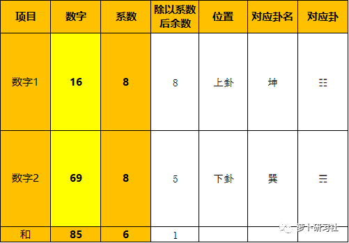 2、取下卦:用第二个数字除以八,余数为下卦,整除则取八