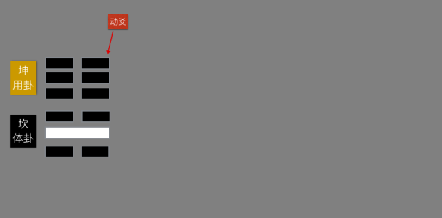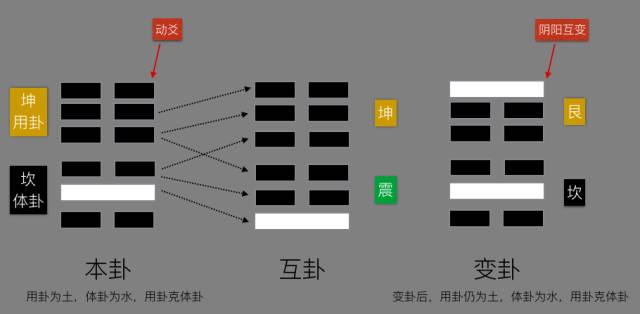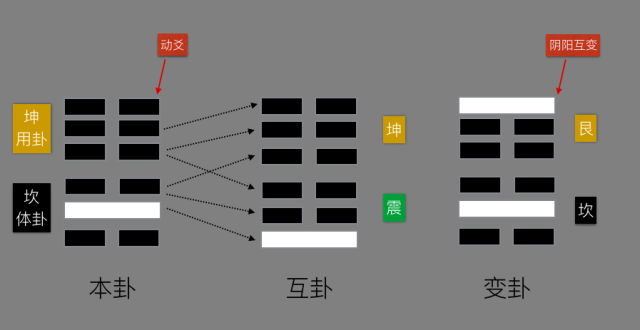 首先是变卦,演变过程很简单,就是动爻作一个阴阳互变。