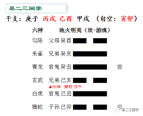 世爻临青龙,青龙代表酒色。卦中两官,财不上卦。一个卦就是一个家庭的缩影,就相当于一个家庭。那么卦里两个官而没有财,官又受月建刑,月建仅仅是判断旺衰而已,月过则无,日辰作用是最大的。所以不要仅仅看到月建帮世爻这个官,官鬼持世,就判断有丈夫,不能这样看的。月建又跟世爻构成相刑,说明她的丈夫婚姻出了问题。那么财不上卦,财伏在兄弟之下,兄弟代表她丈夫的同龄人,财伏藏躲在兄弟之下。卦里边两个官没财,怎么会有婚姻呢?