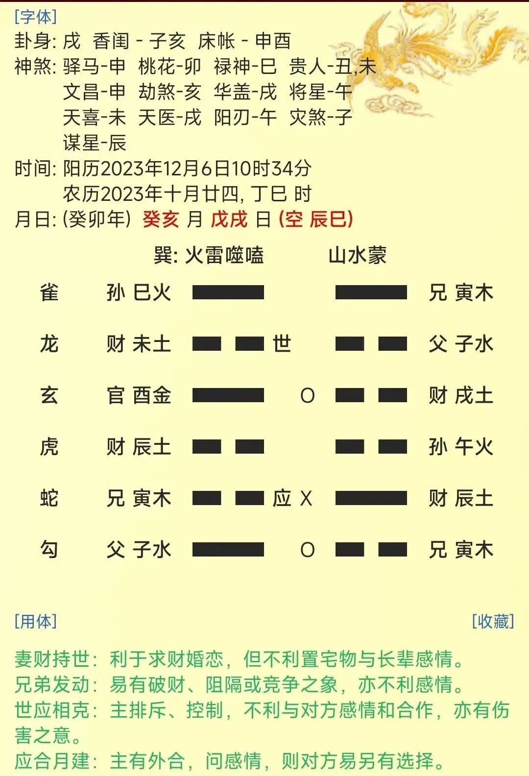 朋友自己也做美容行业多年,但并不看好闺蜜现在所说的盘,何况还要先期投资。 所以她就让我看了一下闺蜜的八字,看到她的八字木弱,喜水木;但明年开始是火土之年,财运会呈下降之势;但仅凭八字就说不能投资,显然有些武断,我就让她摇个卦看一下。我在上一篇文章《六爻解卦:断生意能否谈成的五个考虑要素